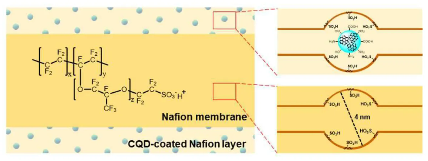 N-도핑 탄소 양자점(CQDs)을 포함하는 다양한 조성물을 Nafion-212 막에 코팅하여 수소 투과도 감소와 함께 형태학 및 이온 전도도에서 향상된 성능을 보임