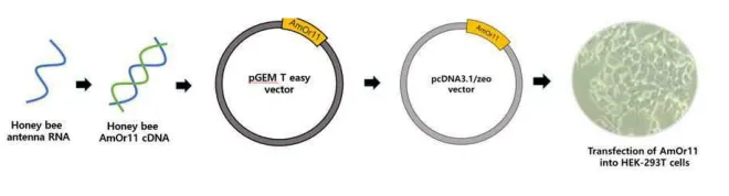 서양벌의 후각수용체 11번(AmOr11)과 공동수용체(Orco)를 코딩하는 뉴클레오타이드 서열을 각각 벡터에 삽입하여 준비함.