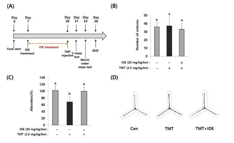 모리스 수중 미로 테스트에서도 패 추출물을 투여한 마우스는 TMT로 인해 유발된 장기 기억 손상이 억제되었음을 보여줌.