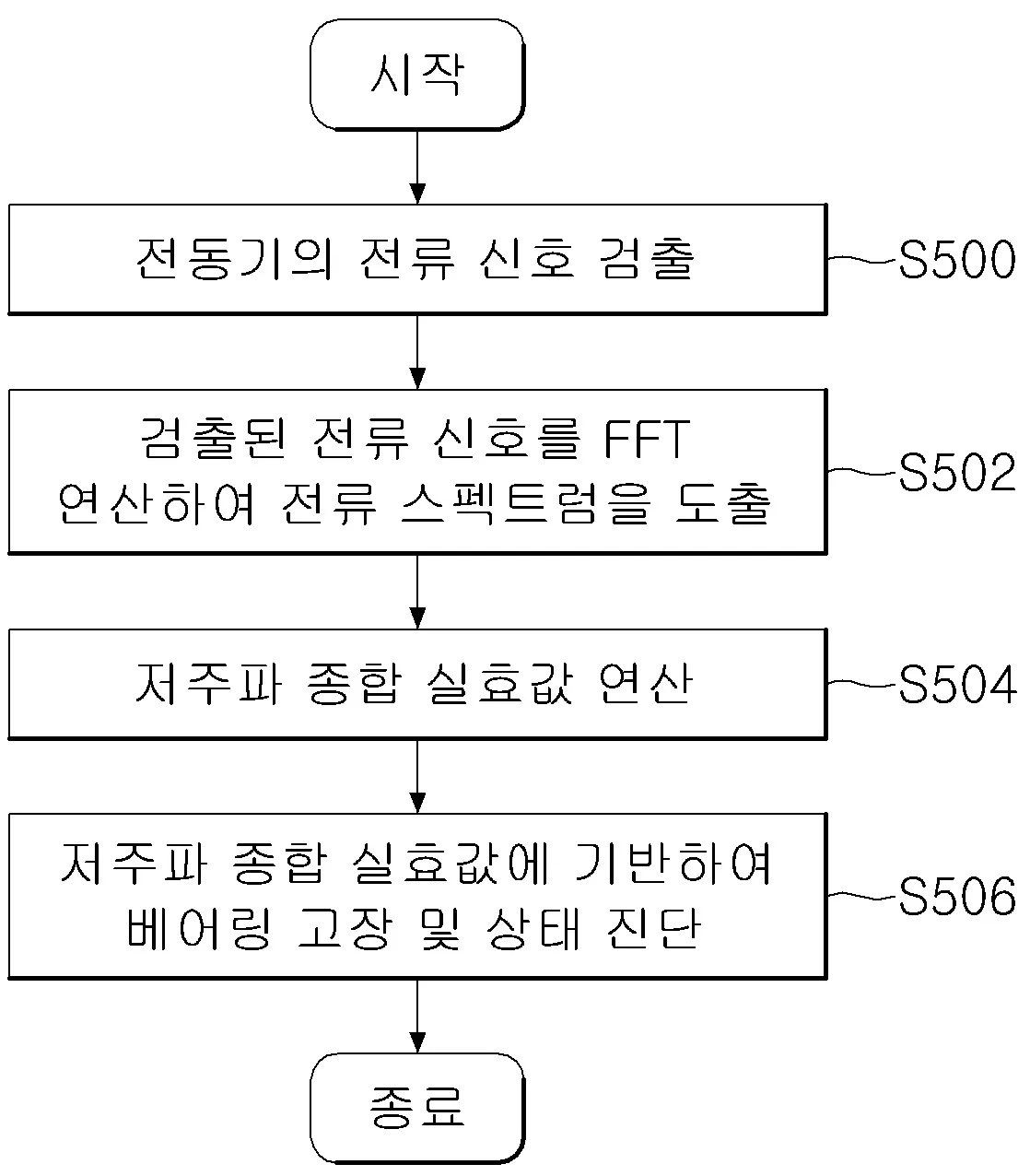 전동기 베어링 고장 및 상태 진단 방법은 전동기 입력 전류의 저주파 종합 실효값의 변화를 이용함.