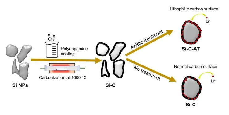 실리콘 나노 입자 표면에 폴리도파민을 코팅하고 탄화 처리 후, 산화 공정을 통해 탄소 표면을 개질하여 리튬-친화성 사이트를 생성함.