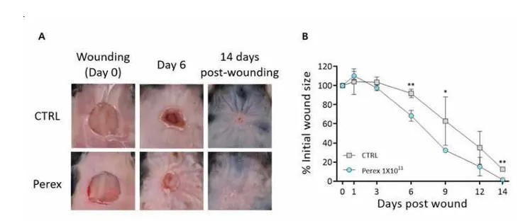마우스 모델 실험에서는 소포체를 처리한 그룹의 상처 치유가 가속화됨. 14일차에 대조군보다 상처 크기가 줄어든 것을 관찰함.