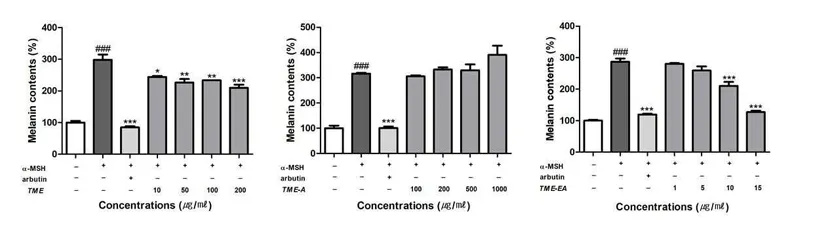 에틸아세테이트 분획물은 멜라닌 합성 억제 효과가 높아 양성 대조군(arbutin)과 유사한 수준의 억제 효과를 보였음 .