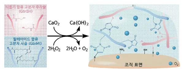 합성된 티올기와 말레이미드기를 함유한 젤라틴 유도체를 혼합하고 과산화칼슘을 첨가하여 하이드로젤을 형성함. 과산화칼슘의 농도에 따라 하이드로젤의 상전이 시간과 기계적 강도를 조절할 수 있음.
