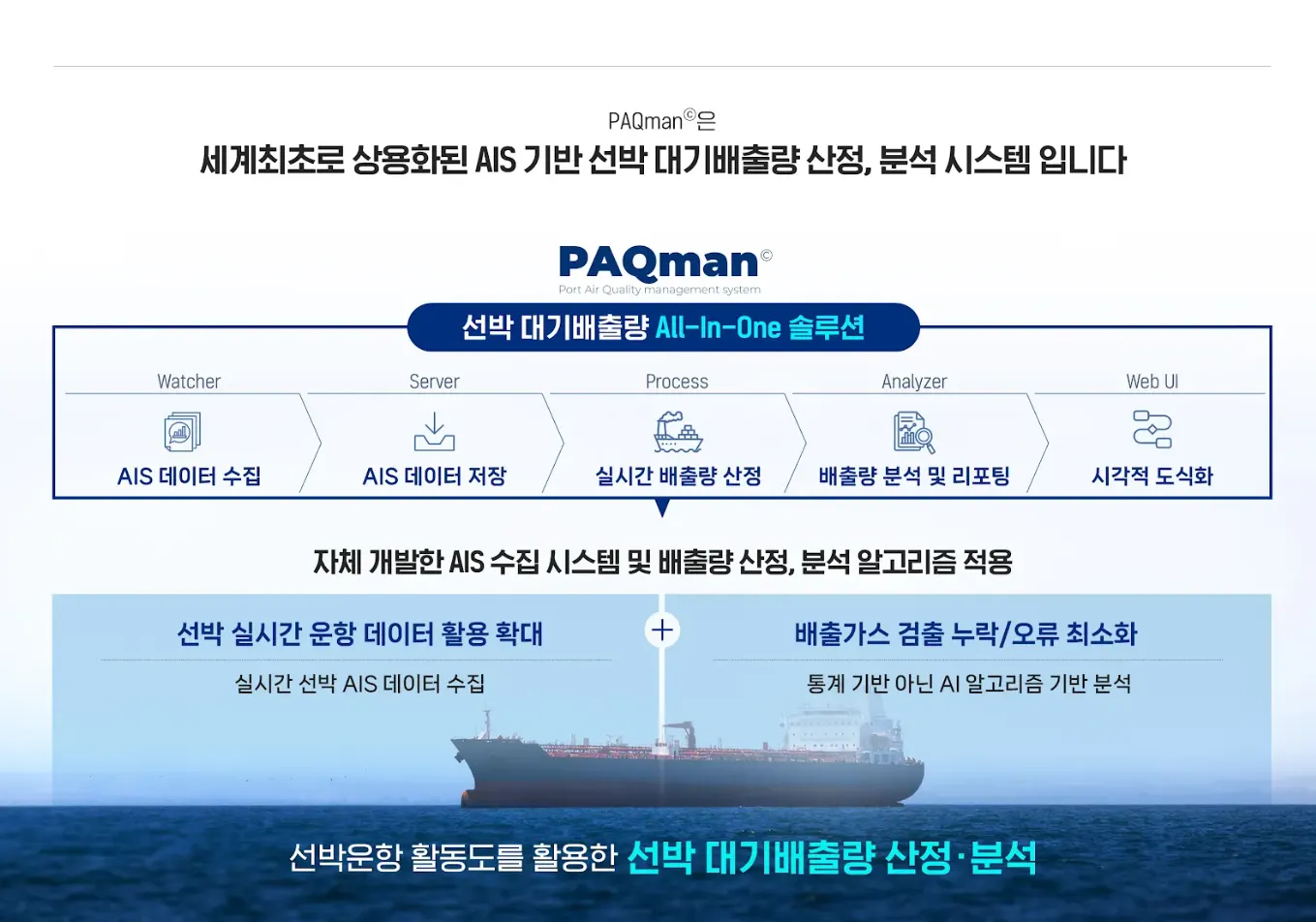 PAQman 시스템은 AIS 데이터를 기반으로 선박 기인 대기오염물질 및 온실가스 배출량을 매우 정밀하게 산정할 수 있습니다.