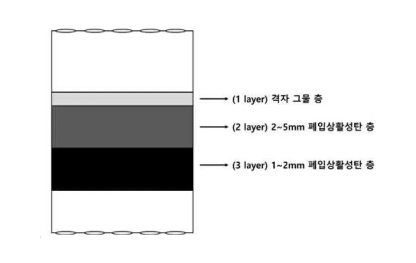 내부의 제1활성탄층과 제2활성탄층은 각각 다른 크기의 입상 활성탄으로 구성되어 다양한 오염물질을 제거함. 특히, 제1활성탄층은 큰 입자의 오염물질을, 제2활성탄층은 미세한 오염물질을 주로 제거함.