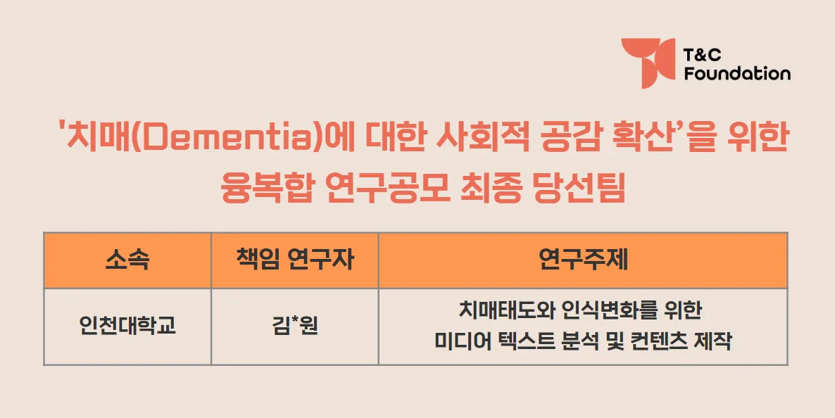 인천대학교 김경원 교수, 한국교통대 신수민 교수, 중앙대광명병원 허준녕 교수로 구성된 빅데이터 융복합 연구팀은 T&C 재단의 지원을 받아 지난 10년간 한국 사회의 뉴스 기사와 시민 감성을 빅데이터 및 인공지능으로 분석하여 연령주의(Ageism)와 세대 갈등의 현황을 드러냈으며, 이를 통해 세대 간 공감을 위한 실효성 있는 교육과 캠페인을 제안했다. 연구팀은 특히 연령별로 나타난 고민과 갈등 요소를 파악하고, 세대 간 접촉을 통한 공감대 형성과 인식 개선의 필요성을 강조했다. 연구 결과는 제주도 포도뮤지엄의 <어쩌면 아름다운 날들> 전시의 기초자료로 활용되어, 연령주의에 대한 사회적 공감을 확산시키고 세대 간 갈등을 줄이는 계기를 마련했다.