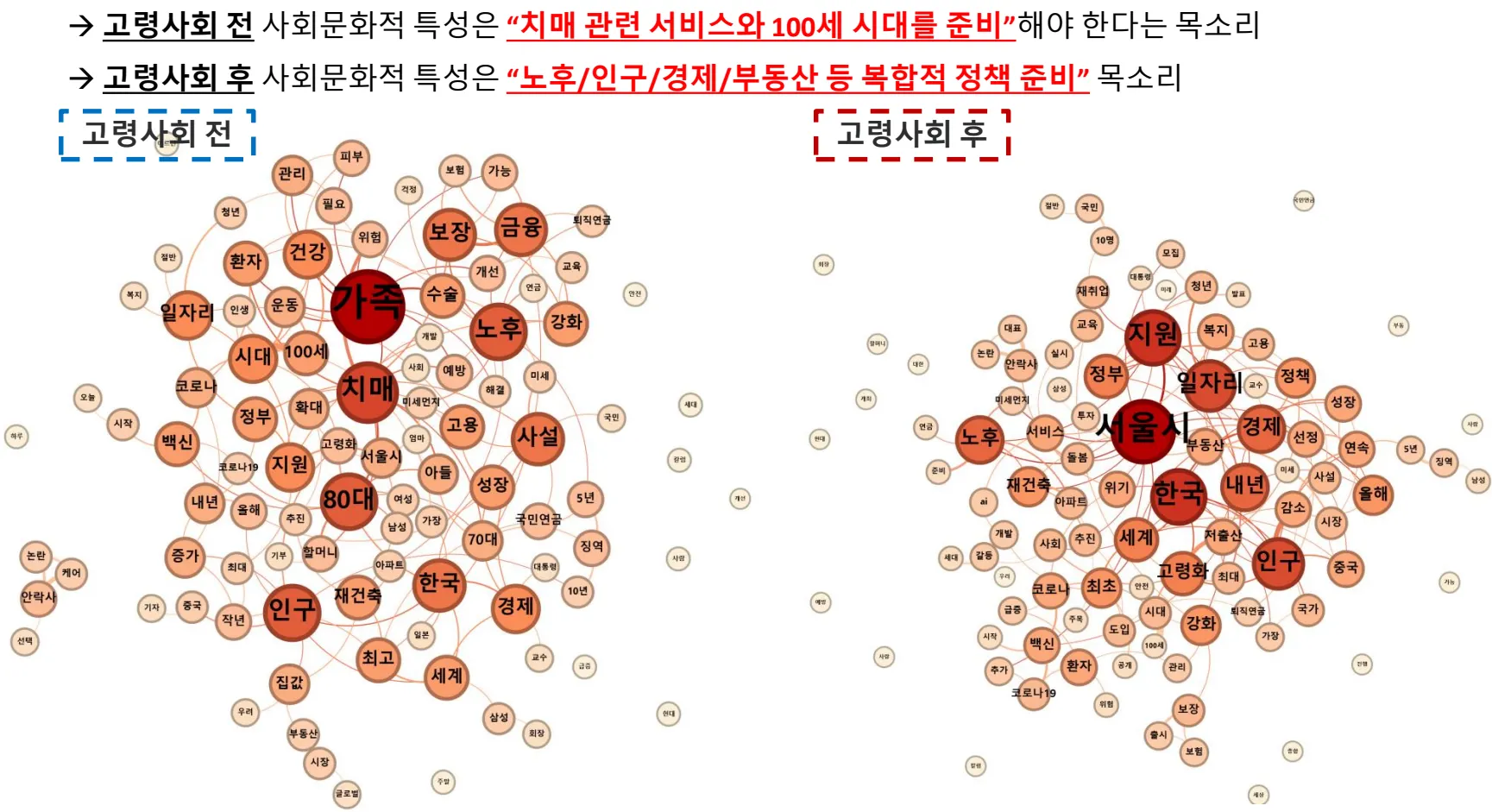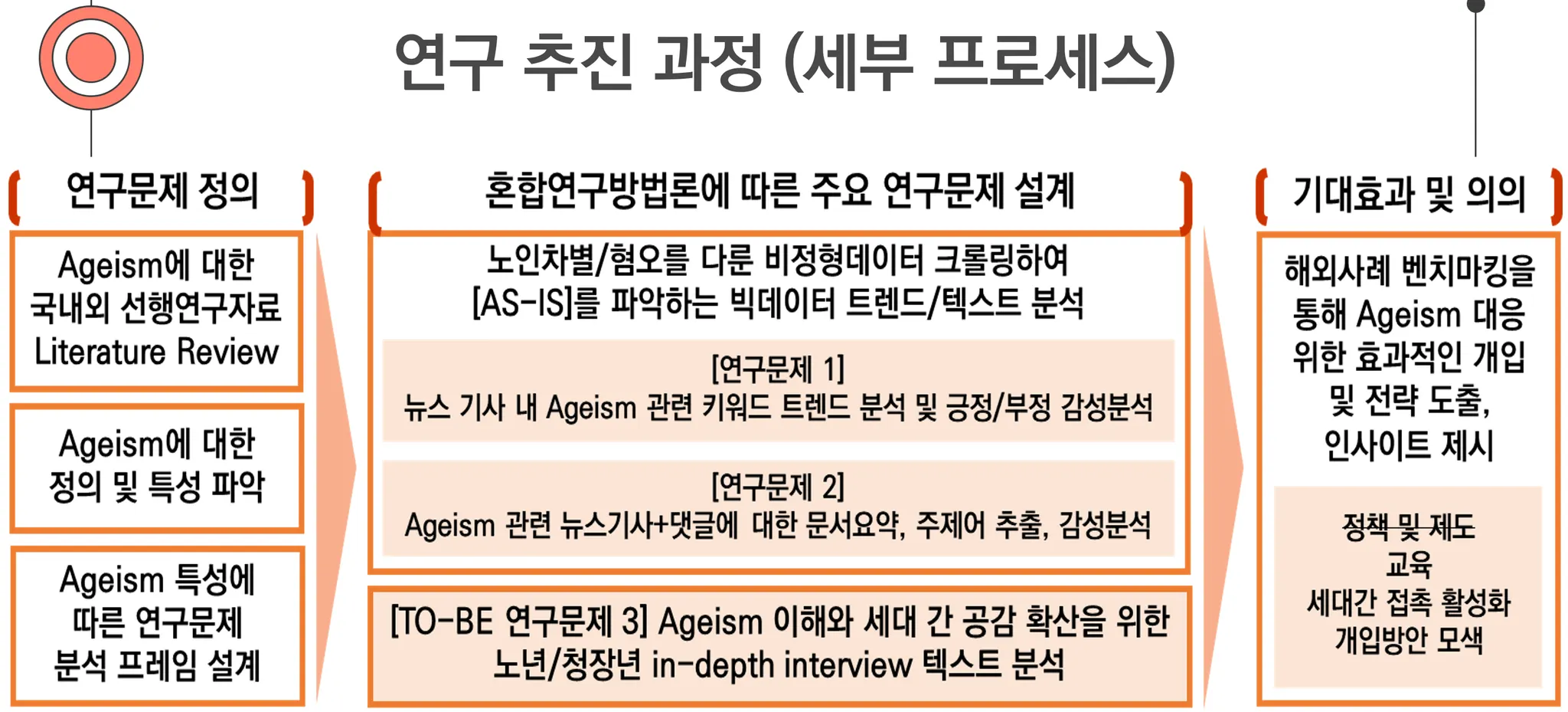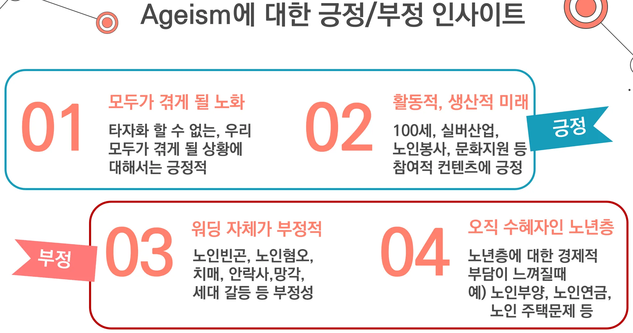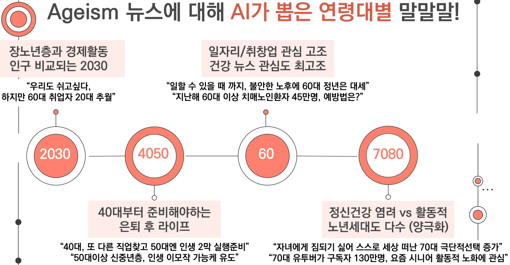 Ageism은 연령에 기반하여 개인 혹은 집단에 대해 사회적 이해, 부정적인 태도, 편견과 고정관념 등을 견지하는 것으로서 정서, 인식, 행동을 모두 포괄하는 현상으로 정의할 수 있다. Ageism 문제 해결을 위해 개입할 수 있는 영역이 무엇이 있을지 고민하기 위해, 2013년 1월부터 2023년 8월까지 약 10년간의 온라인 구글 및 네이버에서 발행된 뉴스 기사들을 파이썬(Python) 크롤링(Crawling) 방식으로 수집하였다. 방송사 5종, 전국 일간지 11종, 경제일간지 8종, 그리고 전문지 2종으로 총 26개 언론사에서 발행한 경제, 사회, 문화, 국제 분야의 뉴스들이 포함된다. 한국의 고령사회 진입 전에는 “100세 시대와 함께 가족적 차원에서 치매를 대비해야 하는 걱정이 사회적 문제로 요약되었으며 이러한 문제를 대비할 서비스”가 필요함이 주된 목소리였다. 그리고 시간이 흘러 고령사회에 진입하면서 “노후, 인구, 경제, 부동산 등 사회적 문제 해결을 위해 서울시와 정부 차원의 복합적 정책” 필요성의 목소리가 높아지는 트랜드를 발견할 수 있었다. 그리고 뉴스 미디어에서 시민들이 긍정 또는 부정으로 느껴지는 단어의 차이를 분석할 수 있었고, 연령대에 따라 어떠한 고민이 있는지 요약할 수 있었다. 향후 미디어와 정부 기관에서 우리 사회의 건강한 공감대와 융합을 위해 참고가 될 수 있는 주요 정보로 생각된다.
