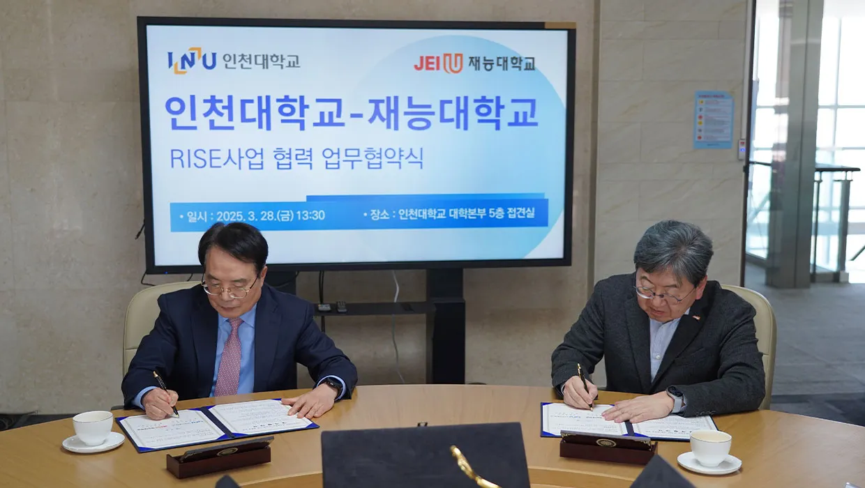 지난 3월 28일 인천대학교에서 인천대학교 박종태 총장과 재능대학교 이남식 총장 간 MOU를 체결하였다. 이를 통해 2025년부터 시행되는 교육부 RISE 사업 추진 시 양 대학 간 교육과정 운영, 산학협력 등에서 활발한 교류를 통해 인천 지역 발전에 크게 기여할 수 있을 것으로 보인다.