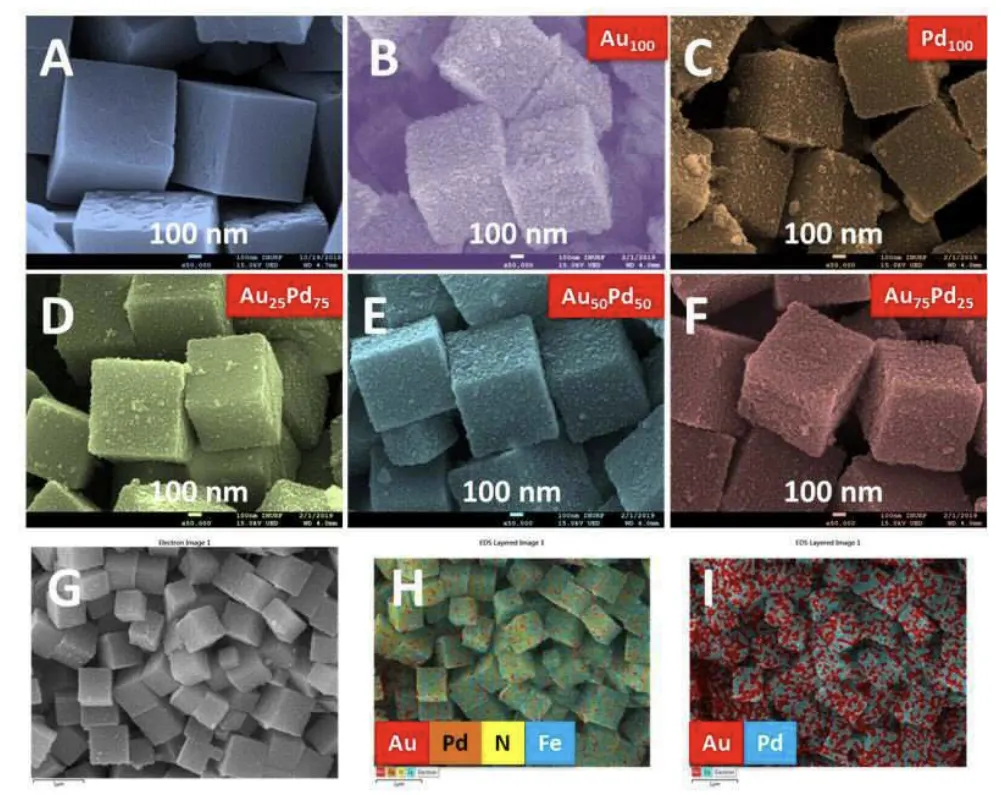 공기 중에서 PB/AuPd를 어닐링하여 적철광 큐브에 내장된 AuPd 합금 NP를 제작하였으며, 이 큐브는 GD 반응의 전구체로 사용되어 Au, Pd 및 AuPd NS를 증착하였음.