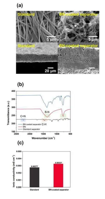 BN 코팅과 TNP 첨가가 분리막의 표면, 화학적 조성, 전기화학적 성능에 미치는 영향을 분석하고, 리튬이온 배터리의 성능을 실험적으로 검증함