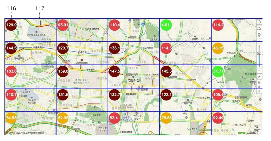 외부 서버로부터 수신한 지도맵 데이터를 바탕으로 도로 교통 데이터를 소규모 지역 단위로 분할하여 캡처함.