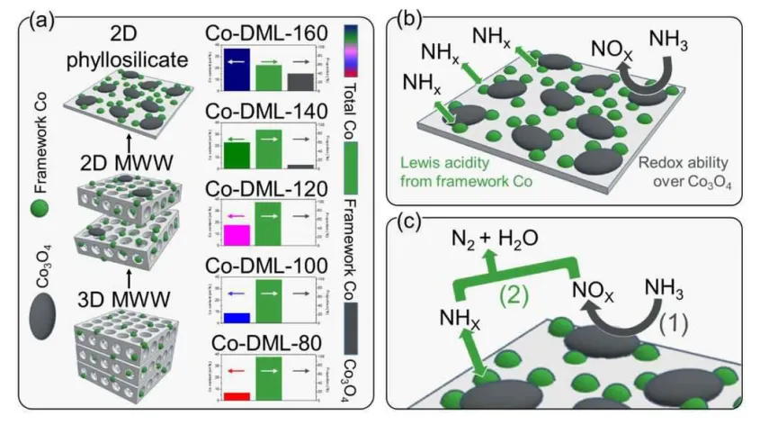 Co-DML-160 촉매는 암모니아의 선택적 산화 반응(NH3-SCO)에서 뛰어난 성능을 보이며, 이차원 구조로 인해 활성 부위의 노출과 생성물의 확산을 돕는 등 암모니아 전환율을 증가시킴