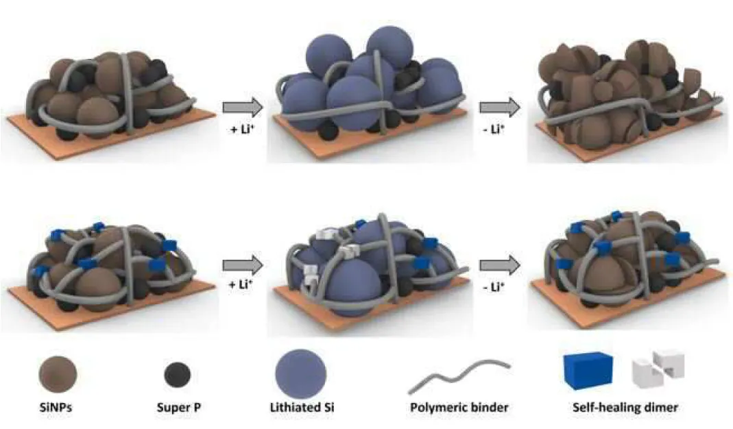 본 발명에서는 새로운 고분자 바인더를 개발하기 위해 디아릴비벤조퓨라논(DABBF)을 폴리아크릴산(PAA)에 도입하였습니다. 디아릴비벤조퓨라논은 가역적인 탄소-탄소 결합과 분해 반응을 이용한 자가 복원 성능을 갖고 있습니다. 그 결과, 실험에서는 이 새로운 바인더를 사용한 음극이 높은 기계적 특성 및 접착력을 보여주었습니다.