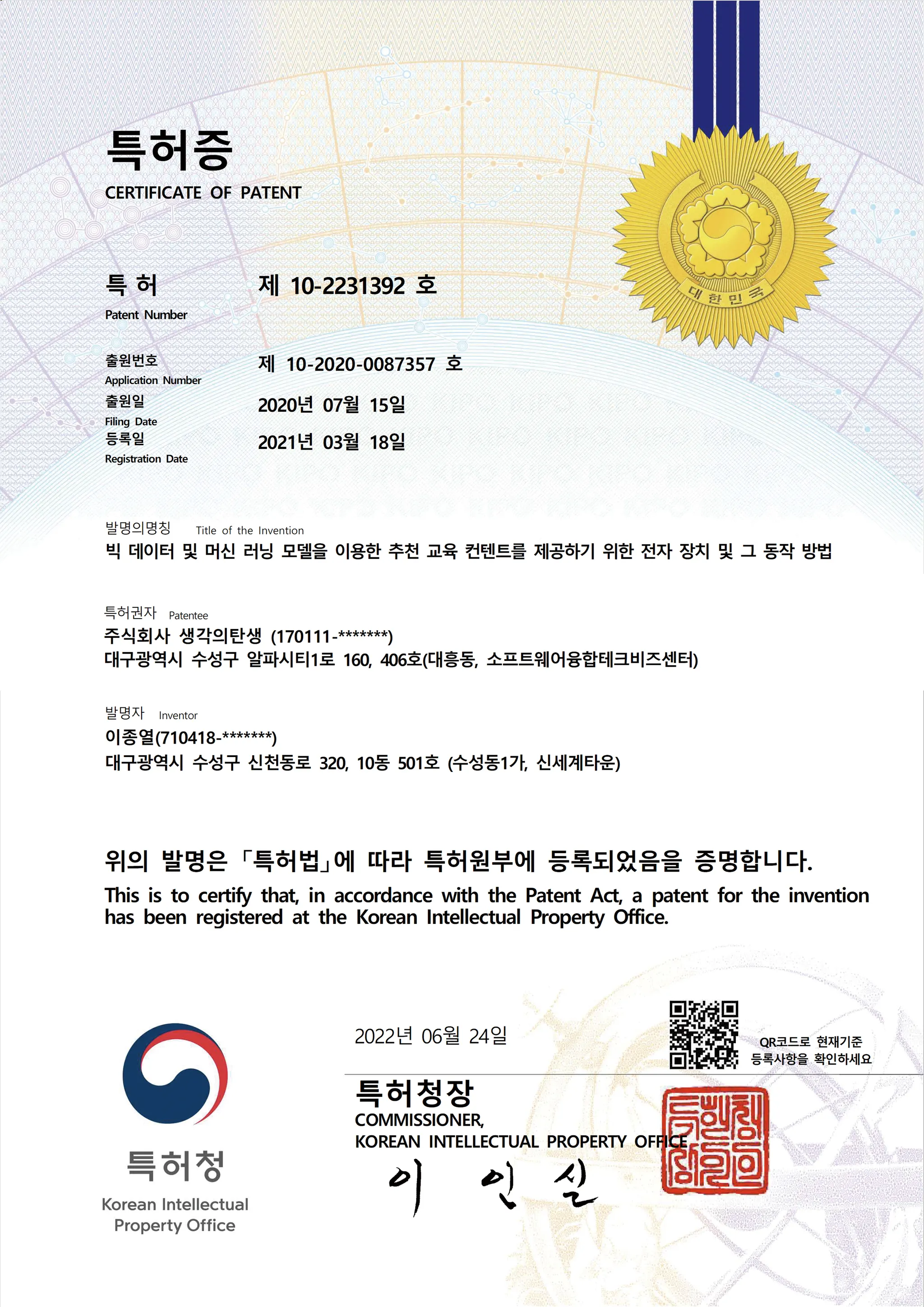 진단방법 : 빅 데이터 및 머신 러닝 모델을 이용한 진단 방법에 대한 특허(제 10-2231392 호)
