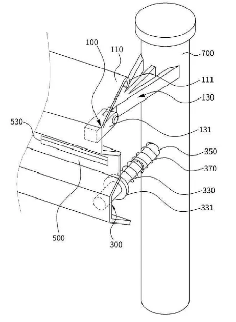 전복 방지 부분은 차량이 접촉 시 회전하며 내려가고, 지지대에 연결된 상단 플레이트는 곡선형 삽입 부분을 통해 아래로 회전 가능함