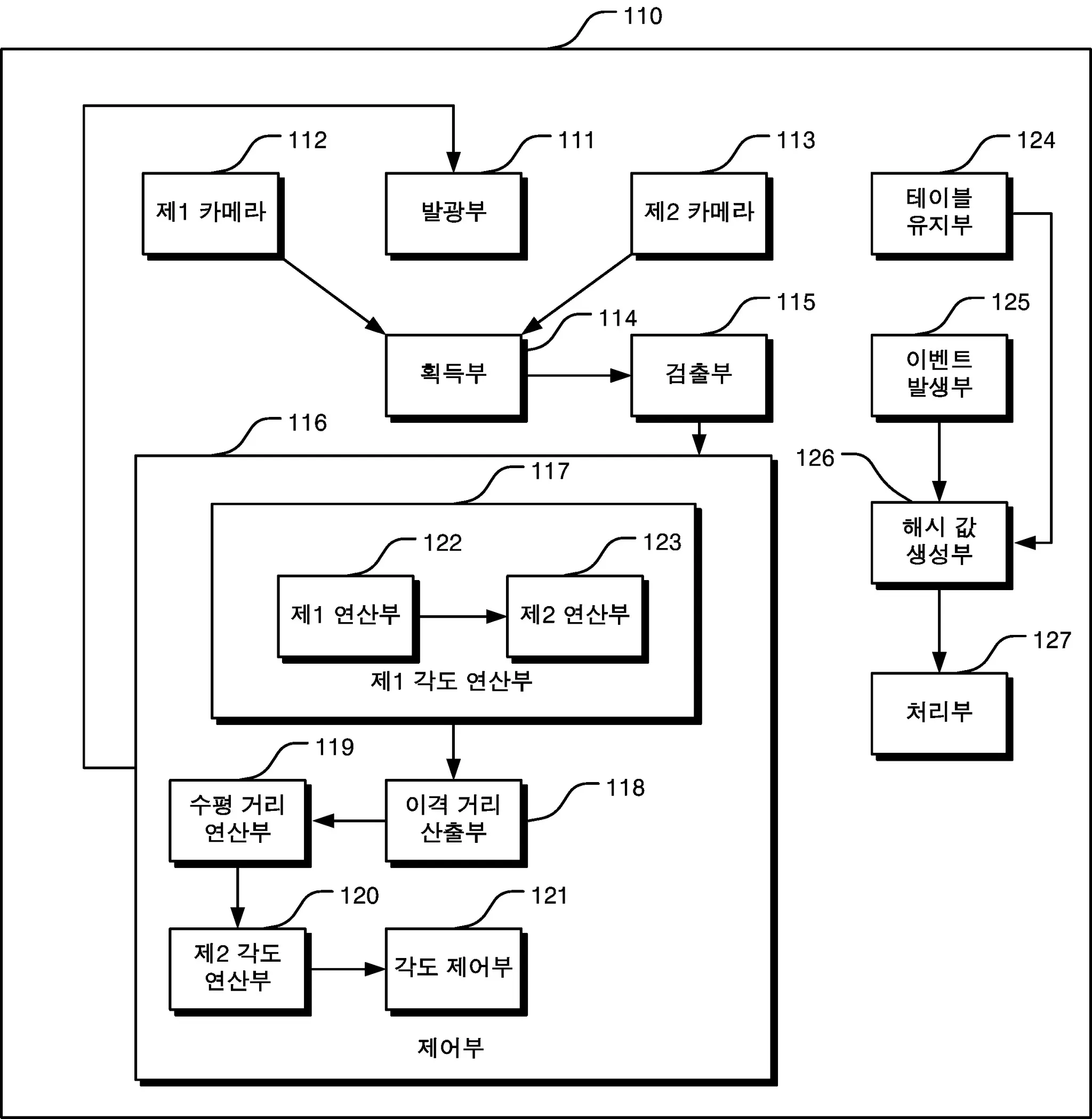 두 개의 카메라: 각각 좌우에 배치되어 전방을 촬영하여 차량의 후방 번호판 위치를 파악함.
