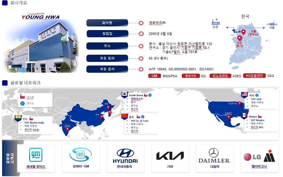 영화테크㈜는 2000년 설립된 자동차 전장부품 전문기업으로, 차량용 정션박스(Junction box)를 기반으로 다양한 자동차 전장 및 전기차 핵심부품 기술을 개발하고 있습니다.