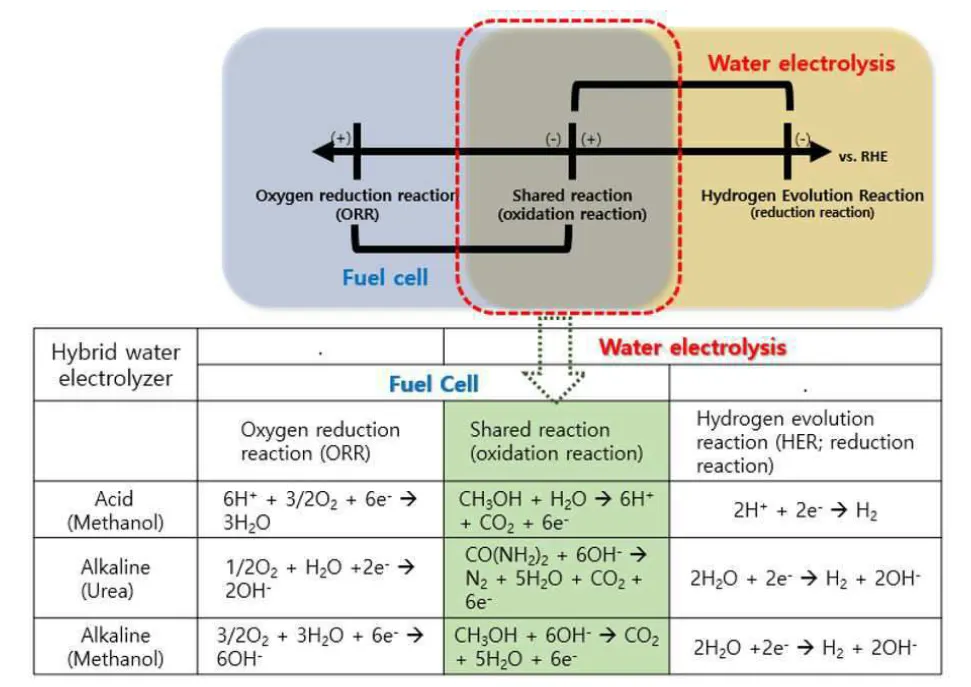 산화반응을 공유함으로써 수전해전지에서 수소 발생을 위한 과전압 문제를 해결함