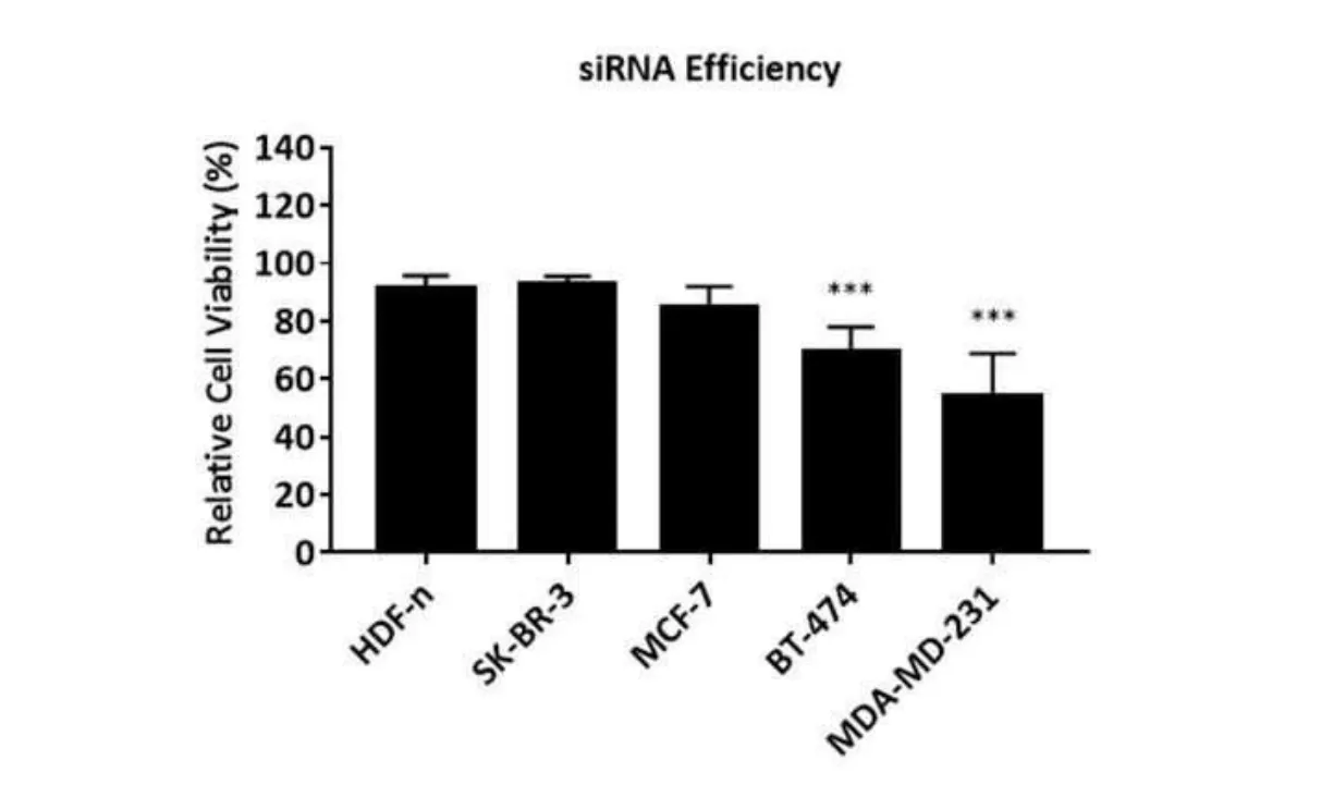 본 발명의 siRNA는 일반 세포에는 낮은 독성을 가지며, 특정 유방암 세포주에 대해 강한 항암 효과를 나타냄. 따라서 기존 치료법이 효과적이지 않은 유방암 치료에 좋은 대안이 될 수 있음.