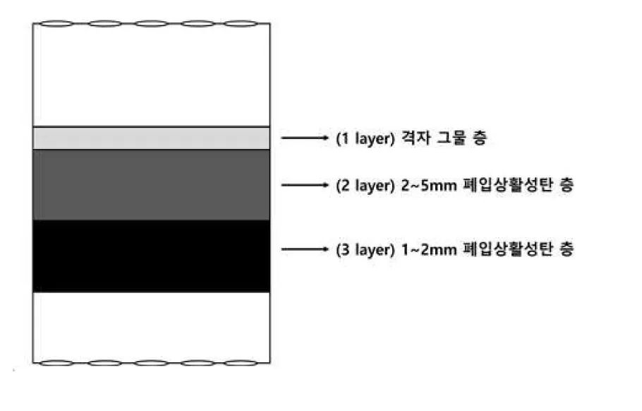 기후 변화 대응형 저류 박스는 내부 공간, 격자 그물층, 두 개의 활성탄층으로 구성됨