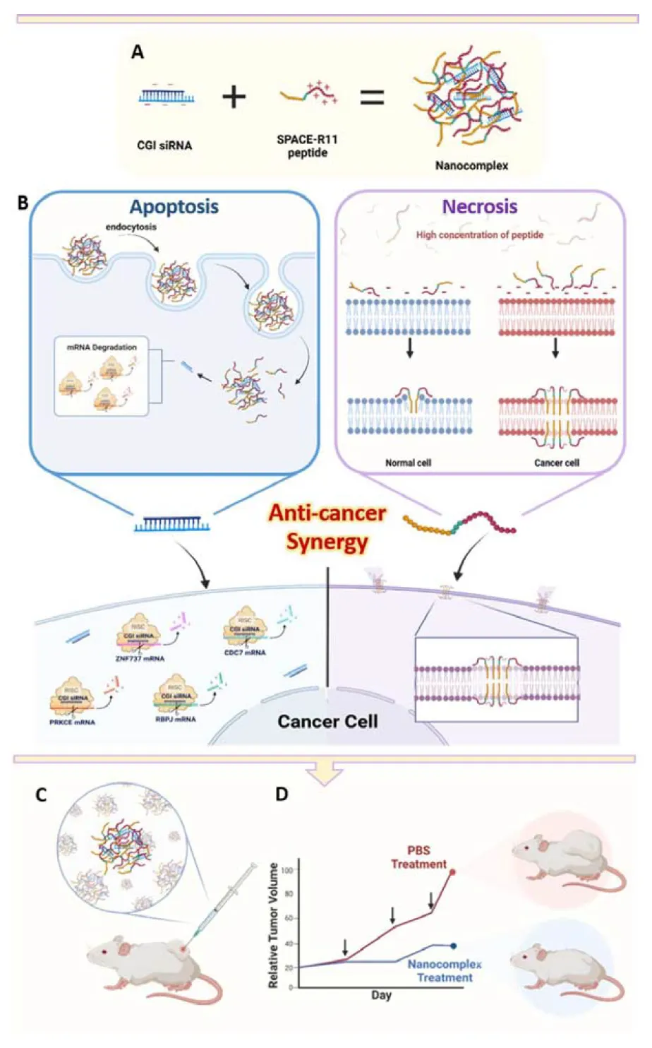 본 기술은 항암 펩타이드와 siRNA를 합쳐 나노복합체를 형성하며, 이를 이용해 삼중음성 유방암의 예방과 치료를 효과적으로 수행할 수 있음이 실험적으로 입증되었습니다. 본 발명의 나노복합체는 세포에 효율적으로 전달되어 암세포의 사멸을 유도하며, 이는 기존 치료법보다 부작용이 적고 효과적인 치료 방법을 제공합니다.