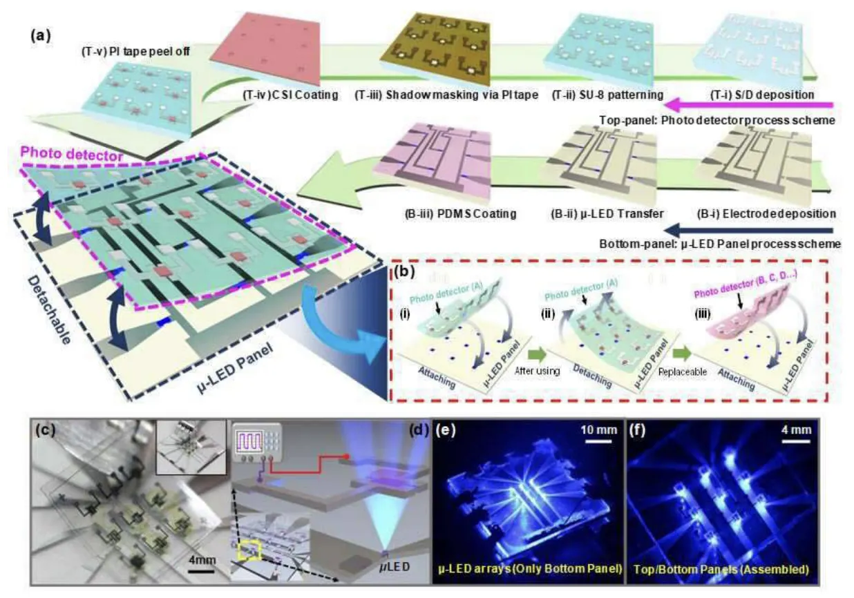 이를 통해 고성능, 저비용, 광학적으로 상호 연결된 광전자 시스템을 위한 하단의 LED 조명으로 분리형 CSI PD 어레이를 제공하며, IoT, VR, AR 소자를 기반으로 한 새로운 개념의 애플리케이션을 잠재적으로 열 수 있음