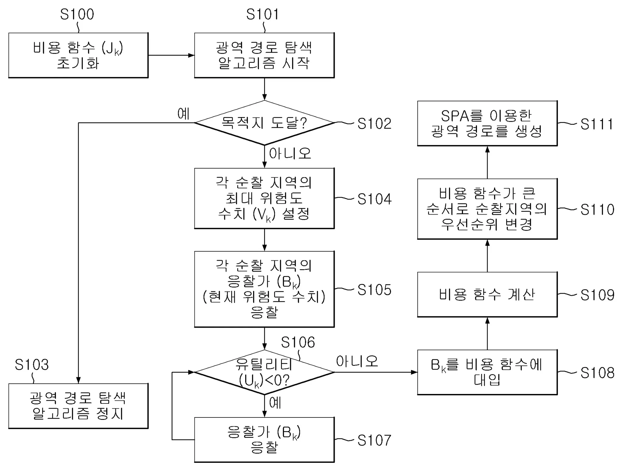 본 발명은 도심 순찰 로봇의 경로 계획에 경매 이론을 적용하여 순찰 지역의 위험도를 응찰가로 정의함. 응찰가에 따라 위험 순위를 정하고, 이에 기반한 광역 경로를 생성함.