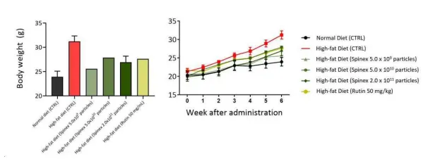 이 소포체는 천연물질로서 부작용이 적고, 대장까지 안전하게 도달할 수 있어 경구 투여가 가능함. 이를 통해 지방 세포의 분화 및 축적을 억제함.